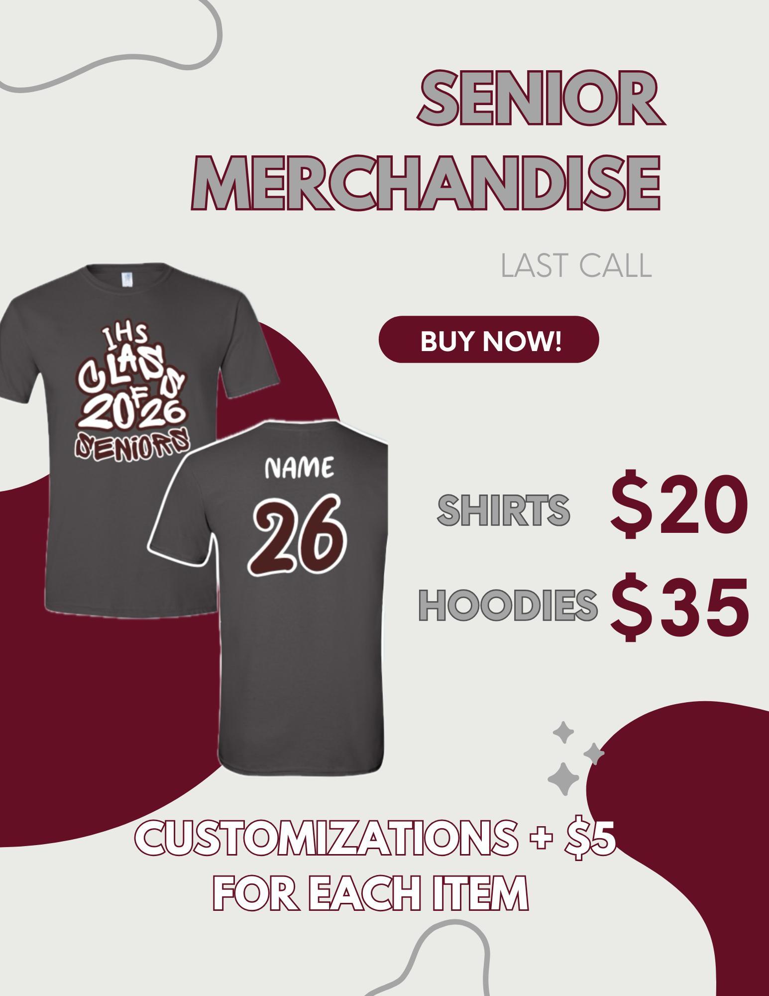 Senior Merch - Final Call!! 🚨 LAST CHANCE! 🚨Senior Year MerchShirts $20 | Hoodies $35+$5 personalization each itemSale ends 1/15/26 🎓 Print